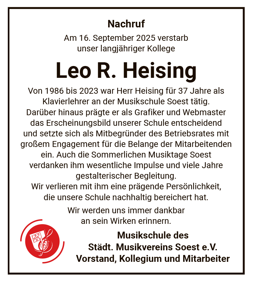 [16.06.2025] Sie sind schon mittendrin in unserer neuen Website: Webdesigner und Webmaster Leo R. Heising hat den Internetauftritt der Musikschule komplett neu gestaltet und strukturiert und auf den neuesten technischen Stand gebracht. Informieren, anmelden, anfragen und direkten Kontakt herstellen: Alles schnell erledigt per interaktiver Kommunikation. Das Aufklappmenü für den jeweilige Menübereich finden Sie stets am rechten Bildrand, das „Hamburger Icon“ mit den Hauptmenüs ganz oben auf der Seite…