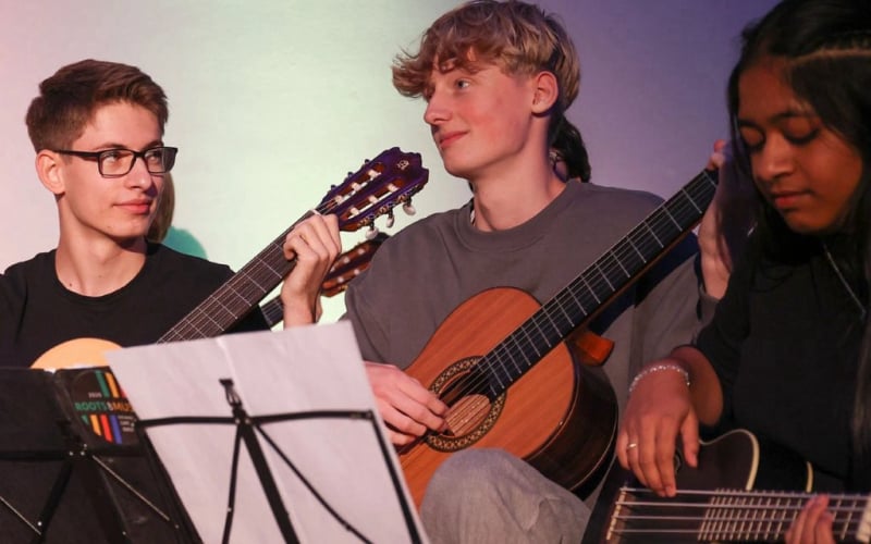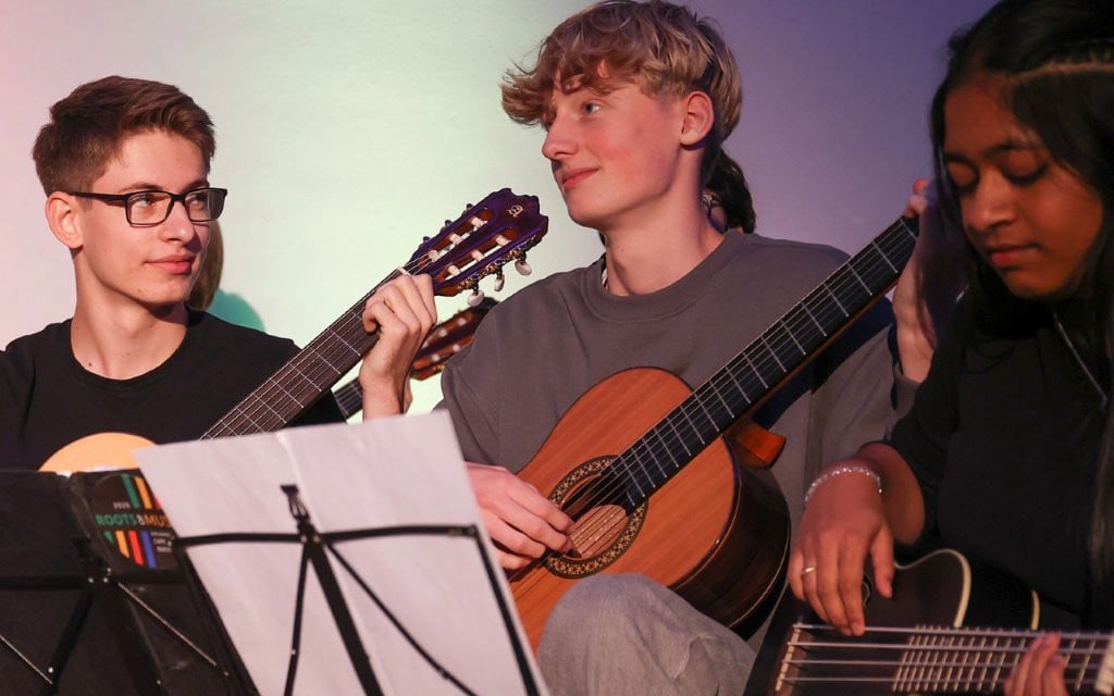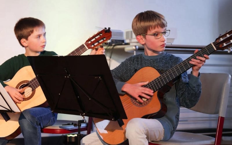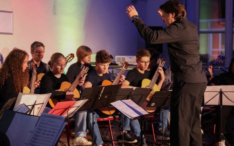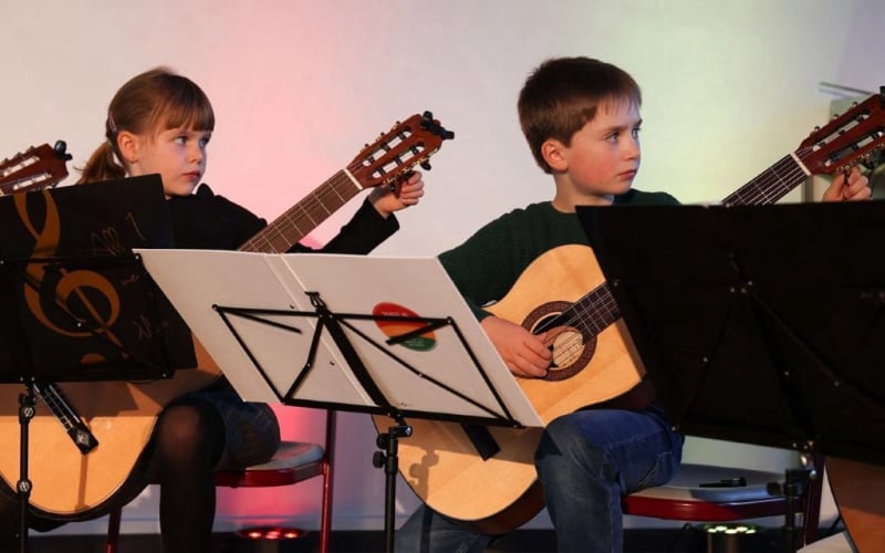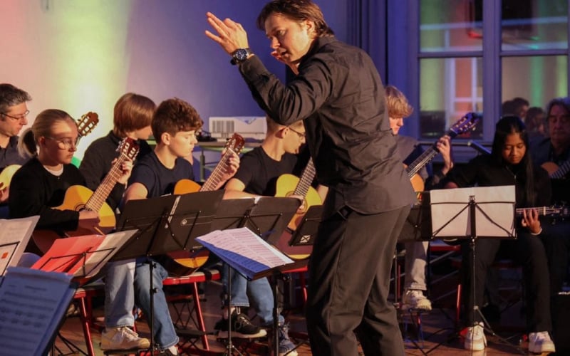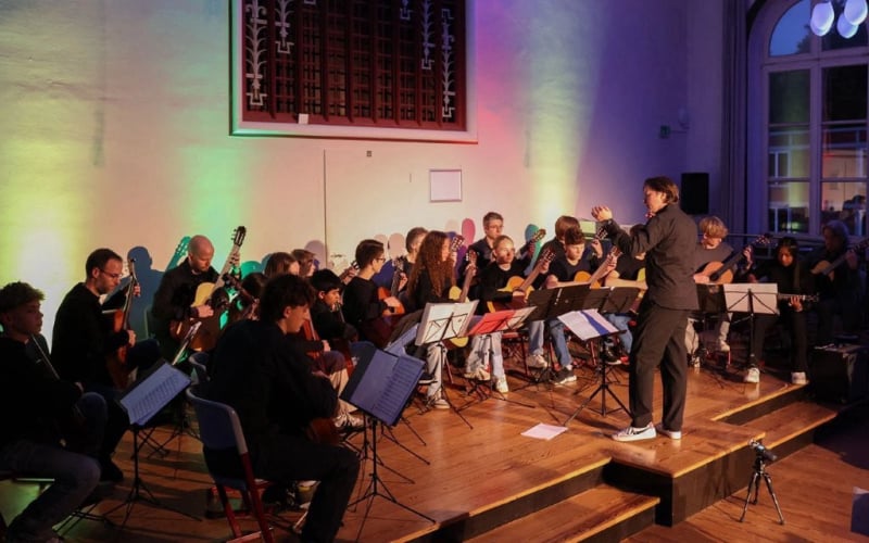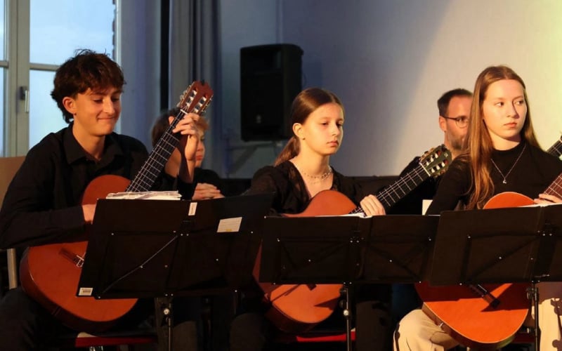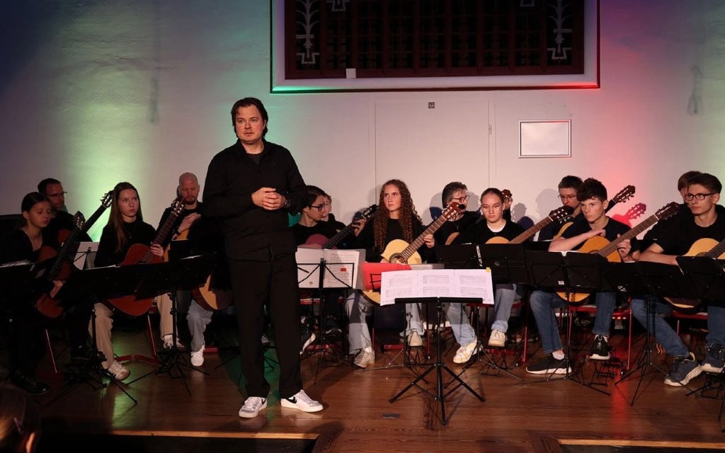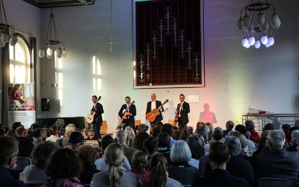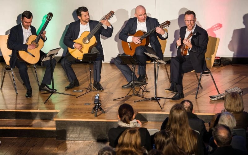 Das Baltic Guitar Quartett, 2004 von vier jungen, talentierten Gitarristen gegründet, wird von lokalen Liebhabern klassischer Musik geschätzt und dem ausländischen Publikum als führendes Gitarrenensemble des Baltikum präsentiert. Das Quartett ist in über 20 Ländern und den renommiertesten Konzertsälen aufgetreten, sein Repertoire umfasst Werke von der Renaissance bis zur Moderne. Die Suche nach einzigartigem Klang und neuen Kompositionen resultiert in eigenen Arrangements von Bach, Rossini oder de Falla sowie Variationen der Balkanmusik und sogar Rockmusik. Das Repertoire wird ergänzt durch die kreativen Werke von Ensemblemitglied Chris Ruebens. In einem beeindruckenden Konzert in der Aula des Archigymnasiums hat das Baltic Guitar Quartett seine Vielseitigkeit und künstlerische Qualität eindrücklich unter Beweis gestellt. Dabei kam sogar die Ukulele zum Einsatz… Gerahmt wurde das Konzert im ersten Teil vom Mittelstufenensemble der Musikschule und im zweiten Teil hatte auch das Soester Gitarrenensemble seinem Auftritt. · Fotos: Dirk Pagels